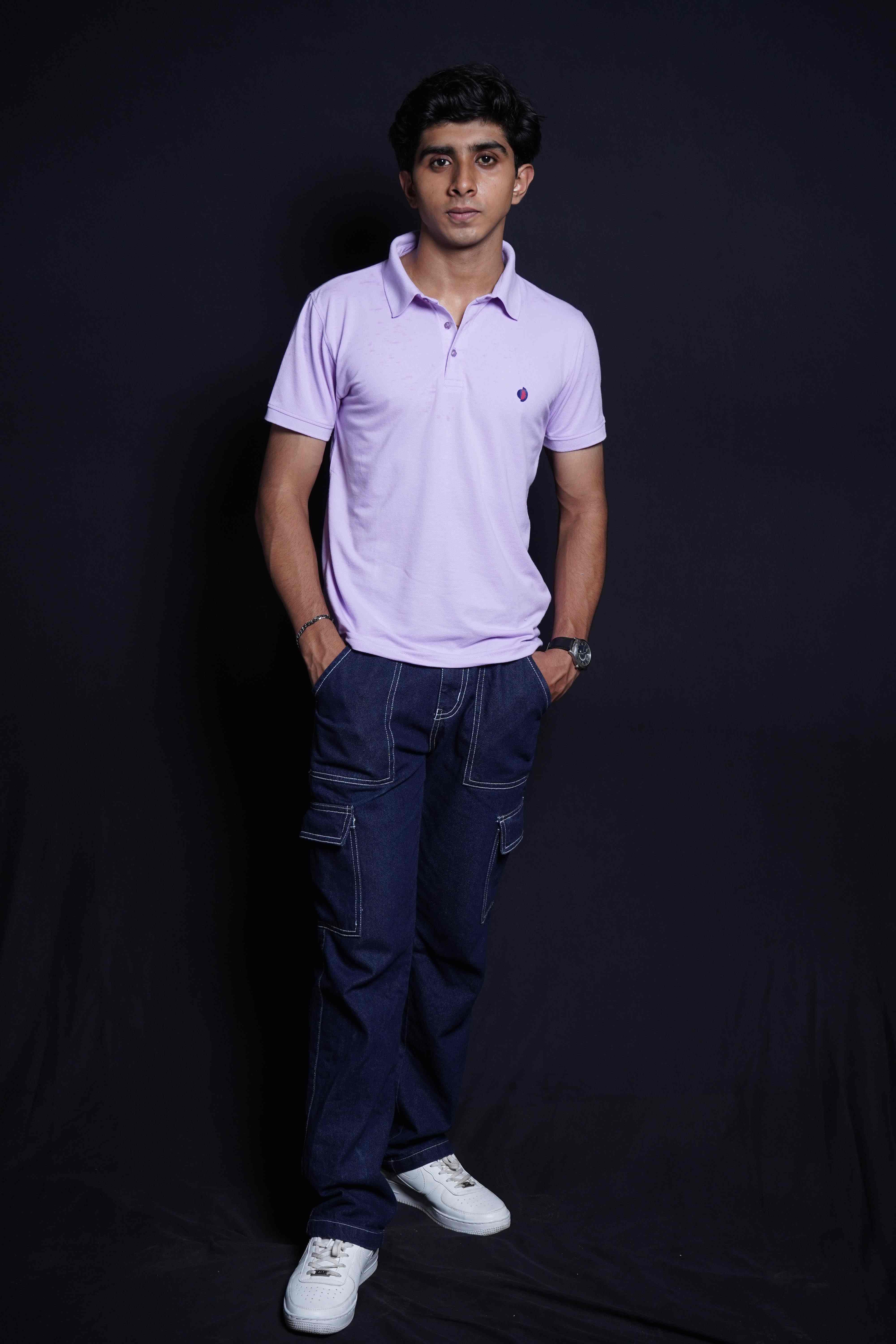 One Denim Light Purple Plain Polo Neck Cotton T-Shirt
