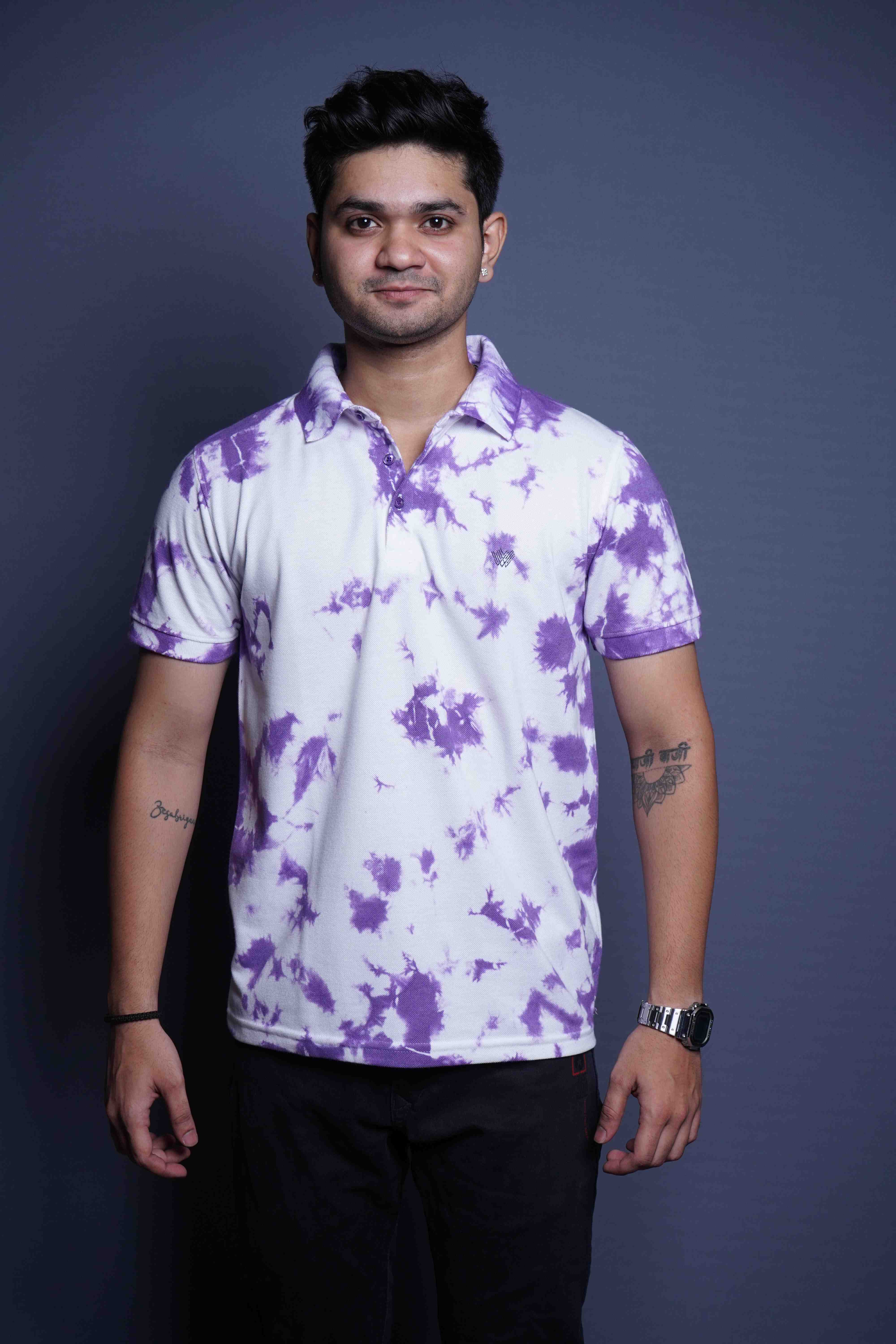 Only White Contrast Light White and Purple Polo Neck Cotton T-Shirt