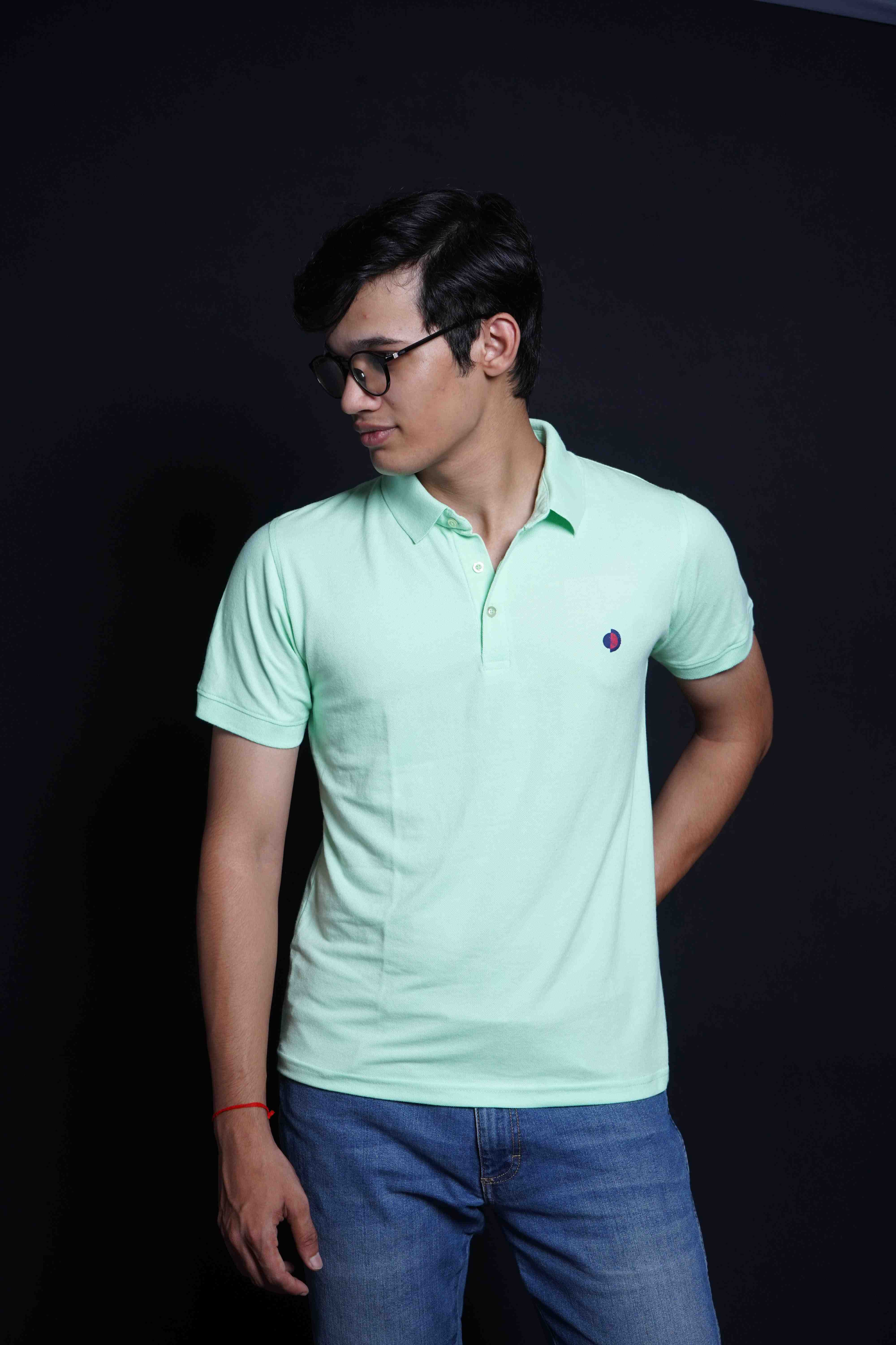 One Denim Light Green Plain Polo Neck Cotton T-Shirt